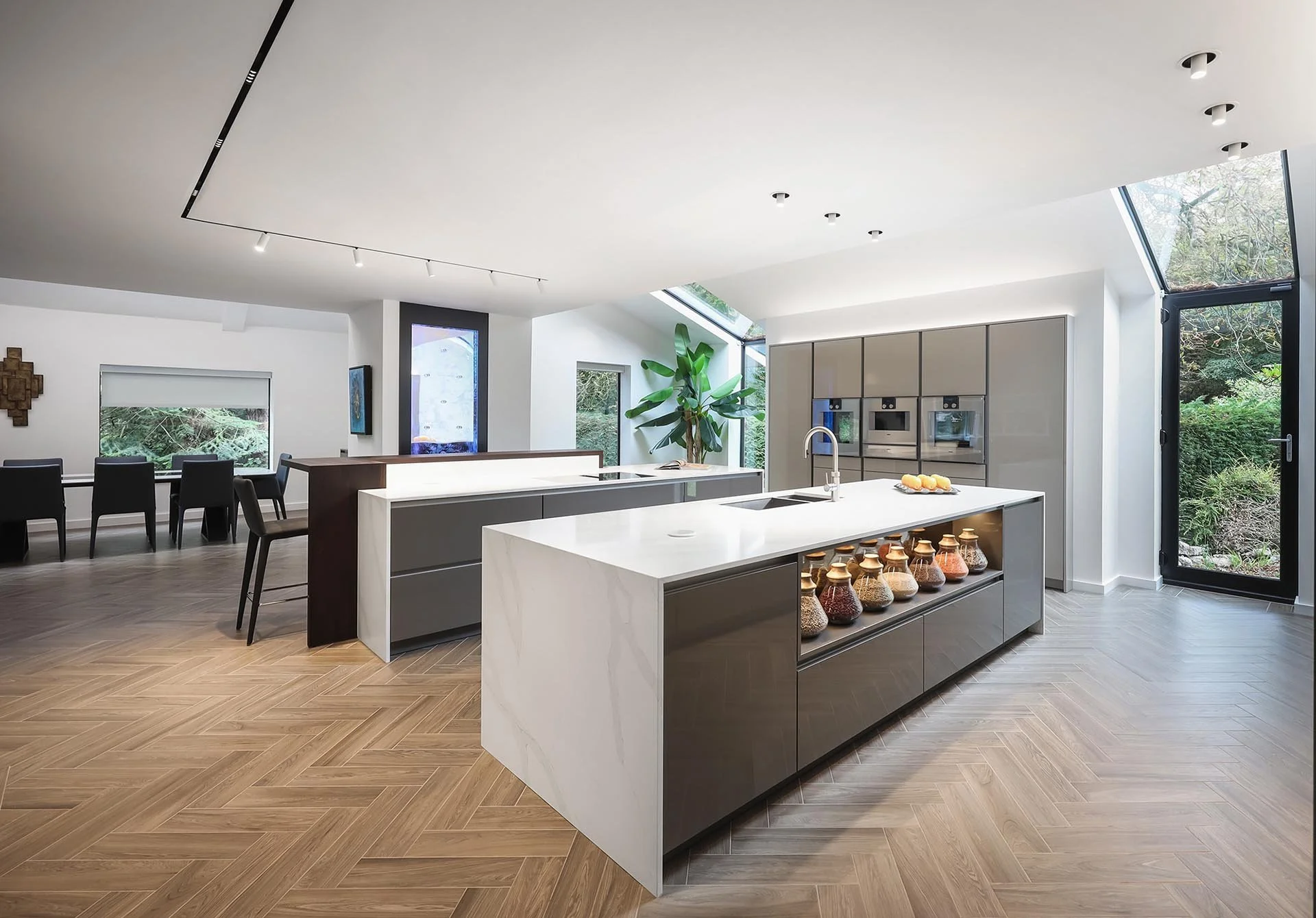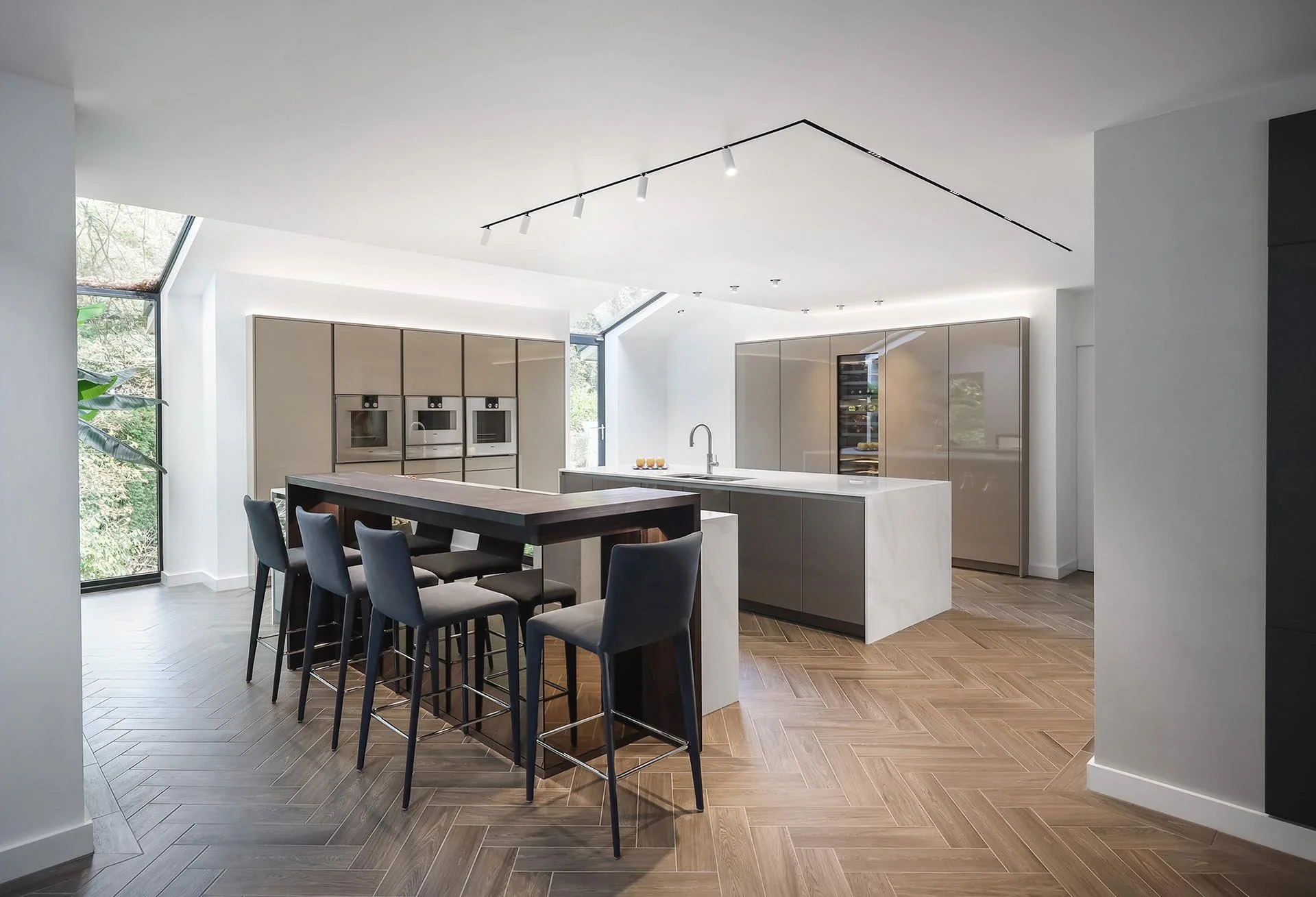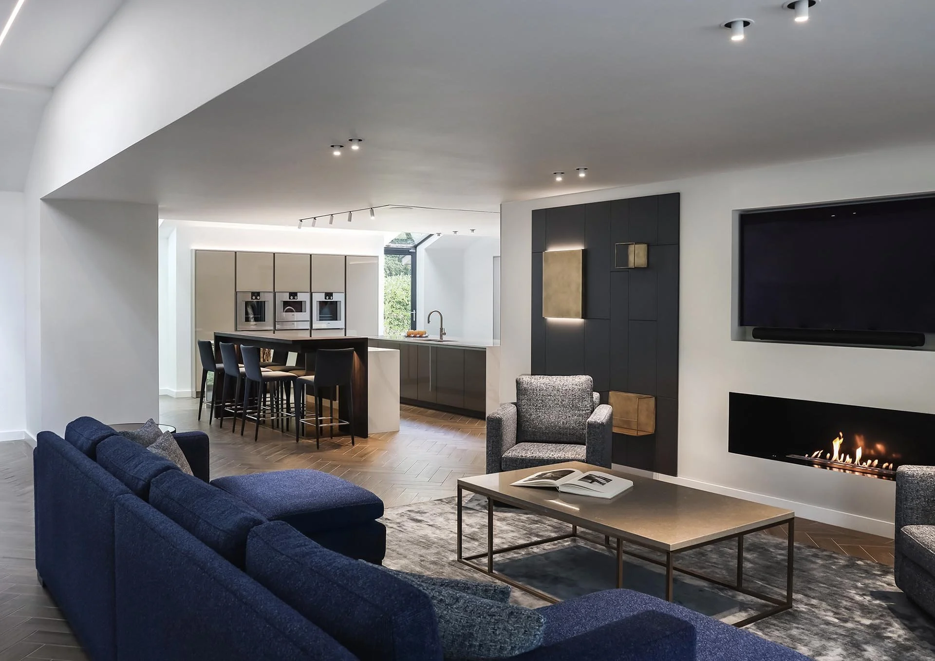 Working with Gail Marsden Design and Finite Solutions controls the challenge was to provide a minimalistic yet effective lighting solution for a modern and very “clean lines” approach to a kitchen- diner and living room extension project in the north west of England.