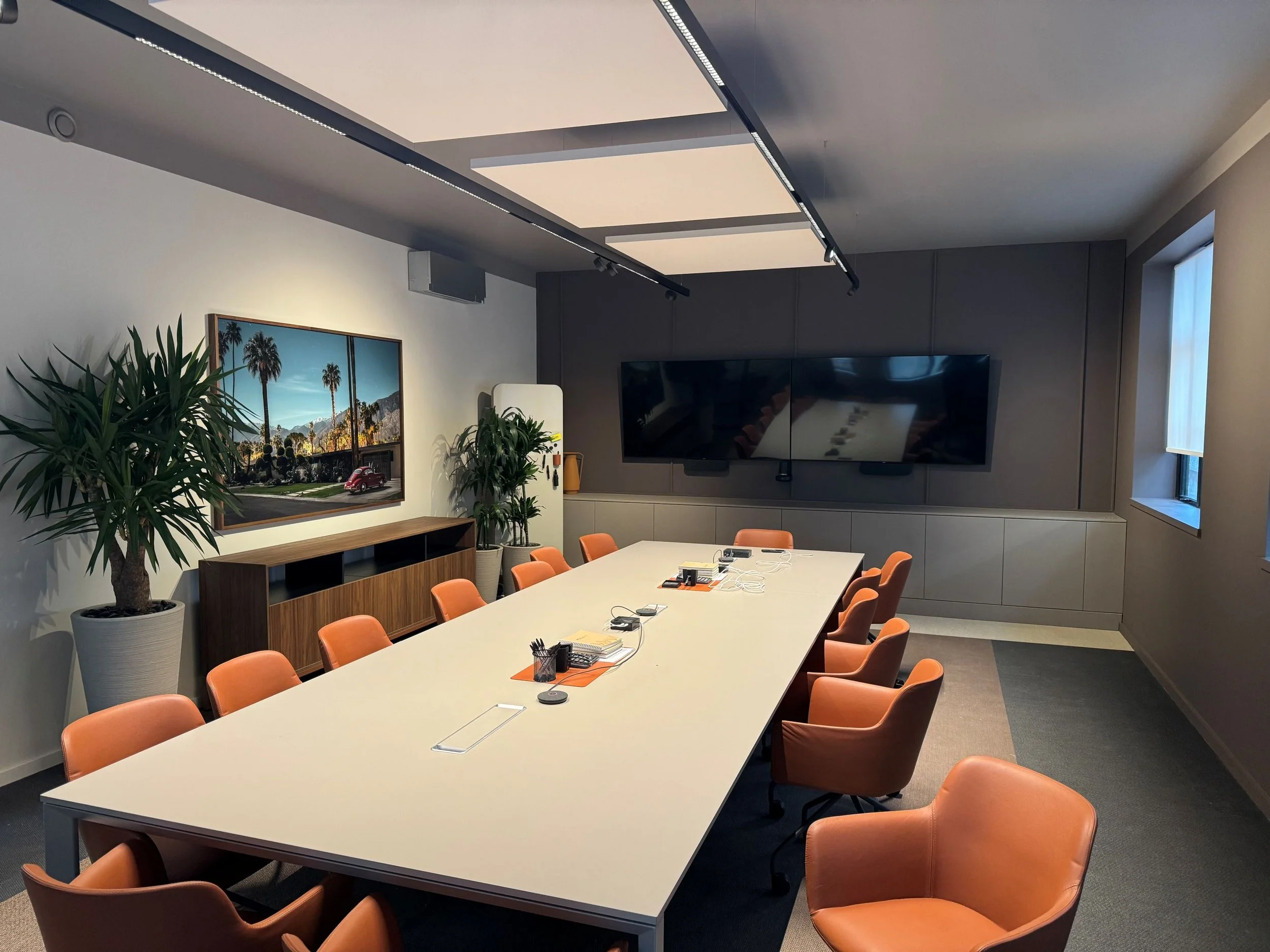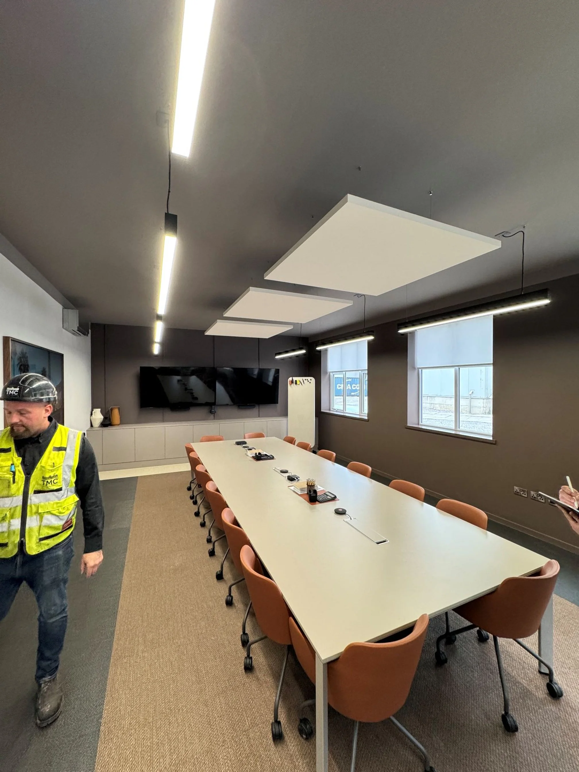 Clients dilemma lied in a boardroom that wasn’t fit for purpose to host productive meetings in person or over the video calls. The position of the basic linear lights originally installed created shadows on the task area as well as created glare and visual impairment due to silhouetting during the video calls.
